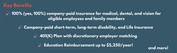 - 100% company-paid insurance for medical, dental, and vision for eligible employees and family members